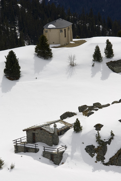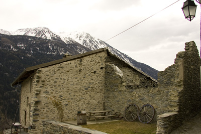 Ci-dessus : Olivier Couach au départ du beau hors-piste de la Niche et vielle bâtisse du village d’Orelle.