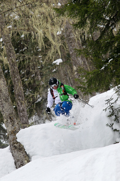 La forêt, c’est là où les virages s’enchainent sans que tu puisses voir la fin du run, là où tu peux croiser une bestiole au creux d’un arbre, mais surtout, c’est là où la neige n’a pas trop travaillé, où elle reste la plus profonde, bref, c’est là où on se poudre le nez à chaque virage. Aux 30cm de fraiche dont on a parlé plus haut se sont rajoutés les 50 posés les jours précédents là c’est du gras, tout s’enchaine comme dans du coton, frénétiquement, méthodiquement au fil des passages, la session tourne à l’orgie !