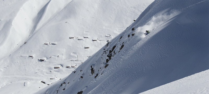 En fond de vallée on arrive souvent sur de petites bergeries d’été presque imbriquée les une aux autres écrasées sous la neige, de quoi rider quelques toits, quoique gaffe à l’effondrement de l’édifice au take off !!